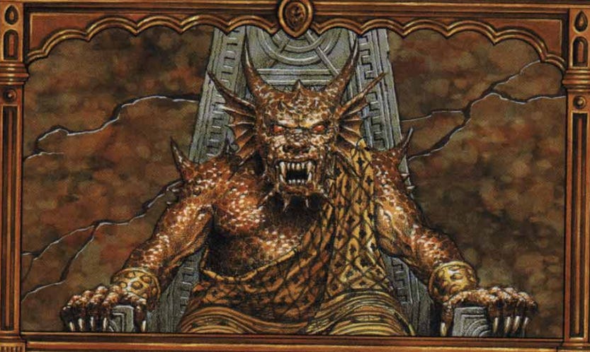 The awnsheglien or Lords of Shadow are Birthright’s great antagonists: Blooded monsters of Azrai’s derivation. Terrain encounters with a Monstrous Shadow should be replaced with Lords of Shadow, though the Judge may use such Lords as Chaotic rulers as well. Lords of Shadow are typically paragons of some natural animal or Chaotic monstrosity.