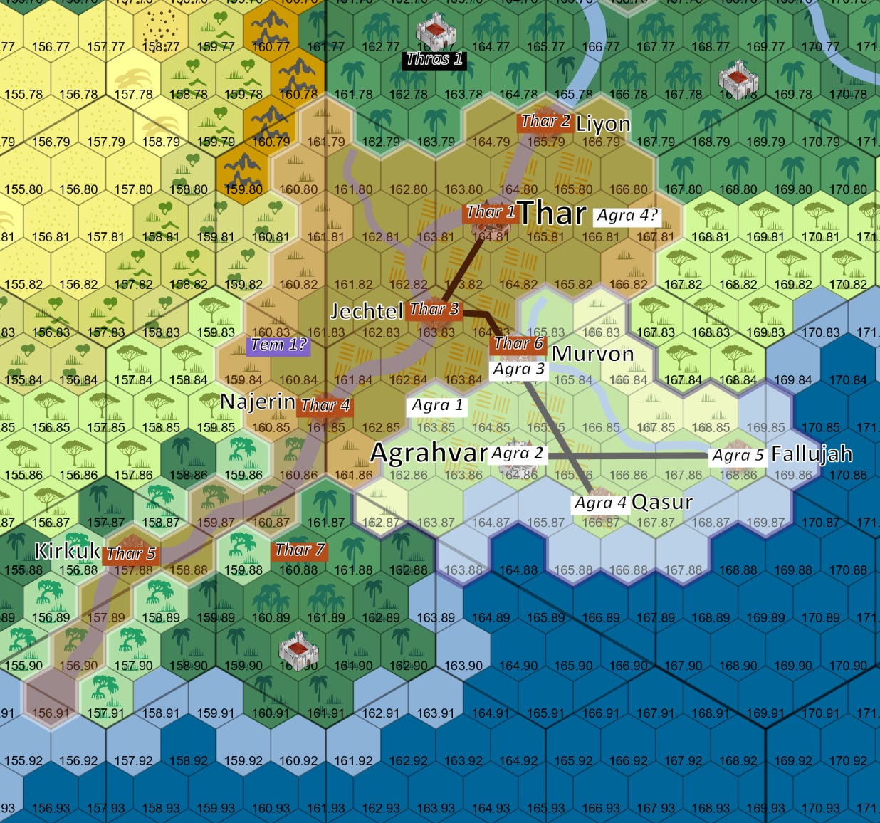 Meanwhile, the Sultan of Agrahvar makes his own bid for conflict, playing it cautious with a “small” but very potent army (“Agra 1”) of cavalry moved to the border of his holdings, within striking distance of multiple targets. Last I checked, he was considering the possibility of bribing the mercenary colonel in whose hands the defense of Jechtel was entrusted into staging a coup that could invite honorable intervention by Agrahvar.